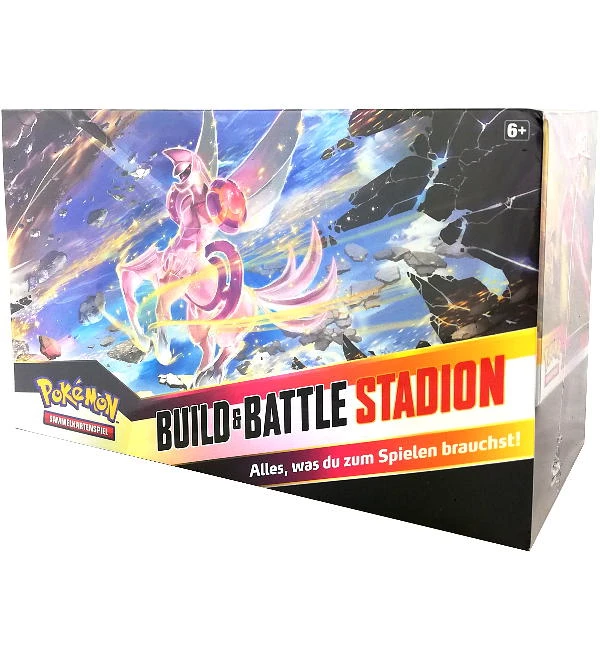 Die Build & Battle Stadion Box (Deutsch) zum Erweiterungs-Set “Schwert & Schild 10 – Astralglanz” des Pokémon-Sammelkartenspiels mit folgendem Inhalt: