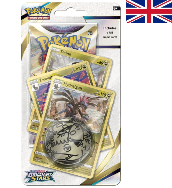 Ein Premium Checklane Blister (Hydreigon) des Erweiterungs-Sets “Brilliant Stars” aus der Pokemon Sword & Shield Serie mit folgendem Inhalt: