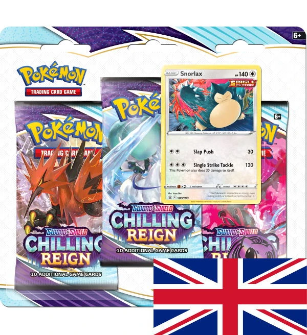 Ein 3-Pack-Blister (Version Snorlax) des Erweiterungs-Sets “Chilling Reign” aus der Pokemon Sword & Shield Serie mit folgendem Inhalt: