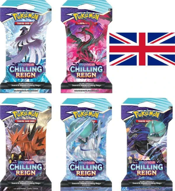 Alle 5 Artworks des “Pokemon Chilling Reign Sleeved Booster” in der Englischen Version. Jeder Booster enthält 10 Pokémon-Sammelkarten der Erweiterung Sword & Shield 6 – Chilling Reign.