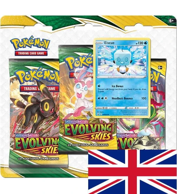 Ein 3-Pack-Blister (Version Eiscue) des Erweiterungs-Sets “Evolving Skies” aus der Pokemon Sword & Shield Serie mit folgendem Inhalt: