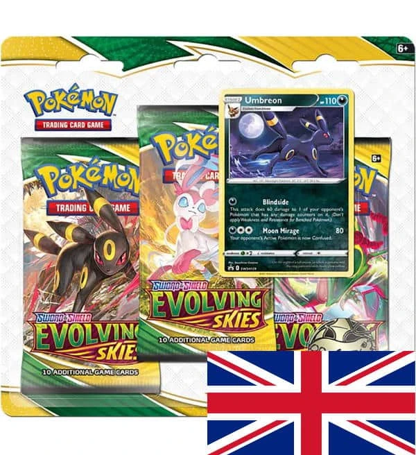 Ein 3-Pack-Blister (Version Umbreon) des Erweiterungs-Sets “Evolving Skies” aus der Pokemon Sword & Shield Serie mit folgendem Inhalt: