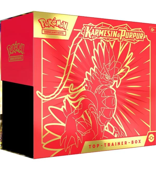 Die Top-Trainer-Box “Koraidon” zum Erweiterungs-Set “Karmesin & Purpur” des Pokémon-Sammelkartenspiels mit folgendem Inhalt: