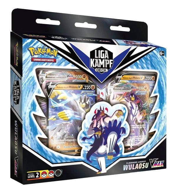 Das Pokemon Liga-Kampf-Deck Fließender Angriff Wulaosu VMAX (Deutsch). Jedes Liga-Kampfdeck des Pokémon-Sammelkartenspiels enthält: