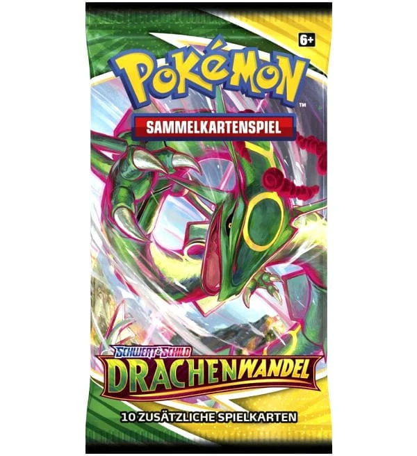Ein Booster mit 10 Pokemon Karten aus dem Set “Schwert & Schild 7 – Drachenwandel”. Die Auswahl des Artworks erfolgt zufällig.