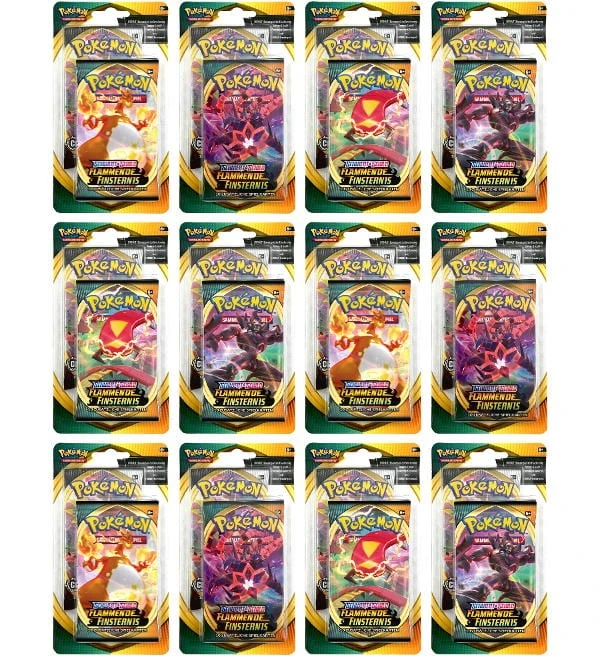 - 12 Booster “Pokemon Schwert & Schild – Flammende Finsternis” mit 10 Karten