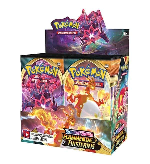 Ein original eingeschweißtes Display mit 36 Tüten (=360 Karten) des Erweiterungs-Sets “Flammende Finsternis” aus der Pokemon Schwert & Schild Serie. Jede Tüte enthält 10 Karten.