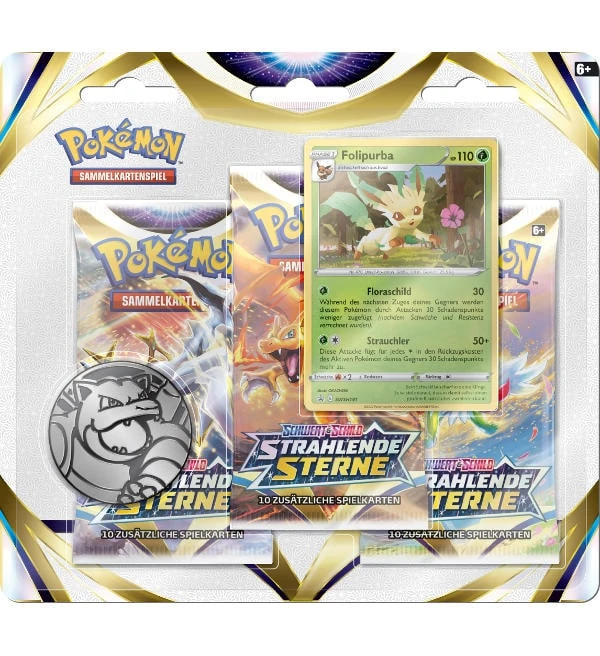 Ein 3-Pack-Blister (Version Folipurba) des Erweiterungs-Sets “Strahlende Sterne” aus der Schwert & Schild Serie mit folgendem Inhalt:
