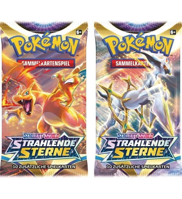 Die Sterne stehen günstig für den Sieg! Von Licht erfüllt sinkt Arceus-VSTAR herab, um seine überirdischen Kräfte mit anderen Pokémon-V zu teilen. Shaymin-VSTAR, Glurak-VSTAR und Elfun-VSTAR verfügen über sagenhafte neue VSTAR-Powers, während Mimigma-VMAX, Stolloss-VMAX und Kingler-VMAX in seiner Gigadynamax-Form mit eigenen gewaltigen Kräften antreten. Entdecke funkelnde Konstellationen und begib dich auf den Weg zu astronomischer Größe mit der Pokémon-Sammelkartenspiel-Erweiterung Schwert & Schild – Strahlende Sterne!