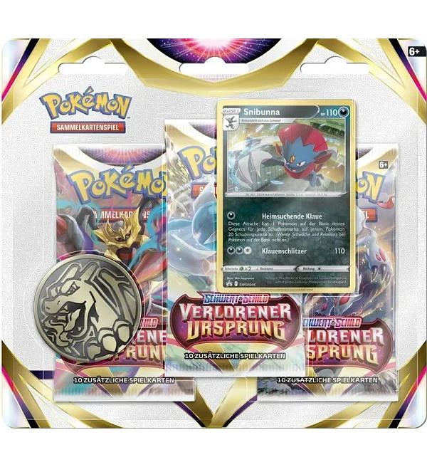 Ein 3-Pack-Blister (Version Snibunna) des Erweiterungs-Sets “Verlorener Ursprung” aus der Schwert & Schild Serie mit folgendem Inhalt: