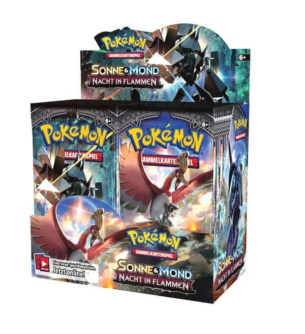 Ein original eingeschweißtes Display mit 36 Boostern der Pokemon-Erweiterung “Sonne & Mond Nacht in Flammen”. Jede Tüte enthält 10 Karten, so dass in der Box insgesamt 360 Cards enthalten sind.
