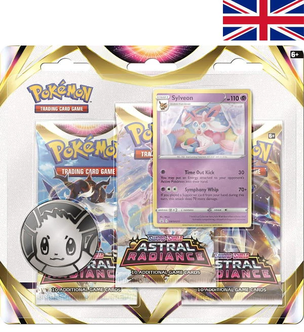 Ein 3-Pack-Blister (Sylveon) des Erweiterungs-Sets “Astral Radiance” aus der Pokemon Sword & Shield Serie mit folgendem Inhalt: