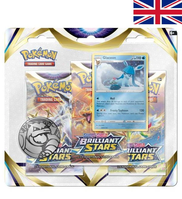 Ein 3-Pack-Blister (Glaceon) des Erweiterungs-Sets “Brilliant Stars” aus der Pokemon Sword & Shield Serie mit folgendem Inhalt: