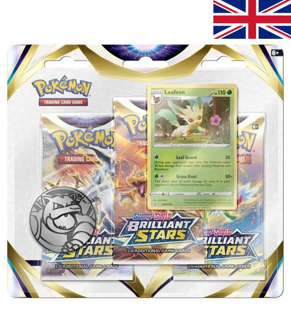 Ein 3-Pack-Blister (Leafeon) des Erweiterungs-Sets “Brilliant Stars” aus der Pokemon Sword & Shield Serie mit folgendem Inhalt:
