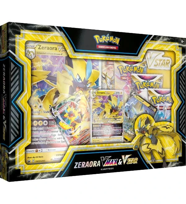 Die Pokémon Zeraora VMAX & VSTAR Kampfbox mit folgendem Inhalt: