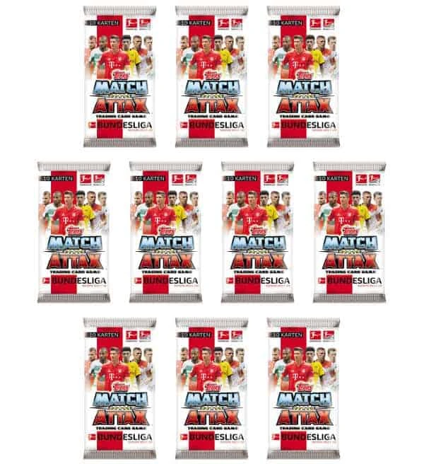 10 Tüten der Topps Bundesliga Match Attax 2019/20 Kollektion. Jeder Booster enthält 10 Karten.