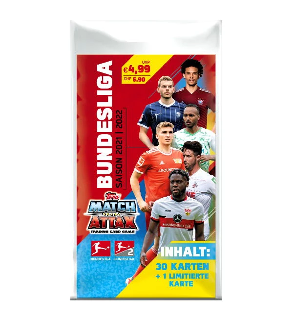 Blister der Topps Bundesliga Match Attax 2021/22 Trading Cards Serie mit 30 Karten + 1 Limited Edition Card.