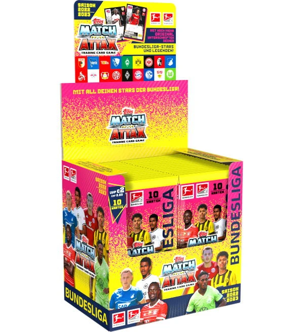 Display mit 36 Tüten zur Topps Bundesliga Match Attax 2022/23 Trading Card Kollektion. Jede Tüte enthält 10 Karten.