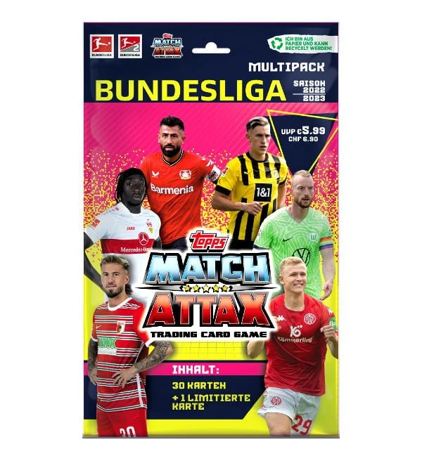 Multipack der Topps Bundesliga Match Attax 2022/23 Trading Cards Serie mit 30 Karten + 1 Limited Edition Card.