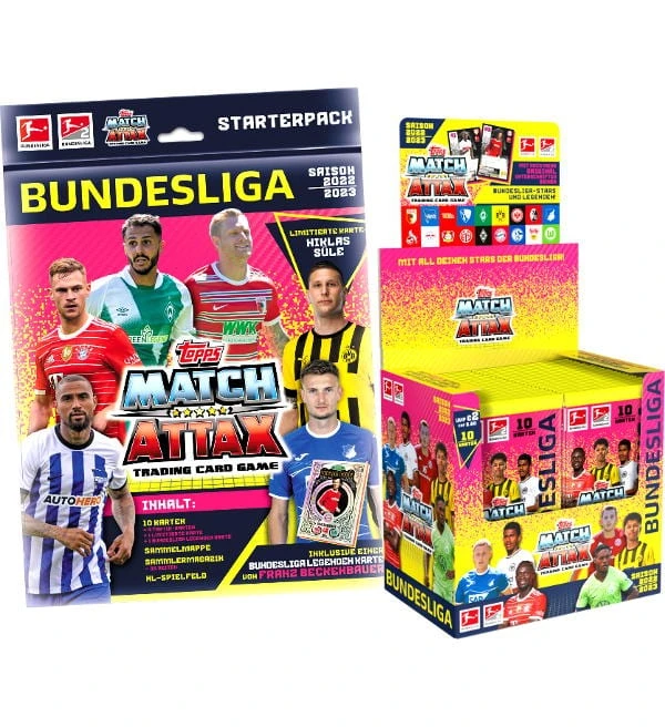 Starterpack + Display mit 36 Tüten zur Topps Bundesliga Match Attax 2022/23 Trading Card Serie mit folgendem Inhalt: