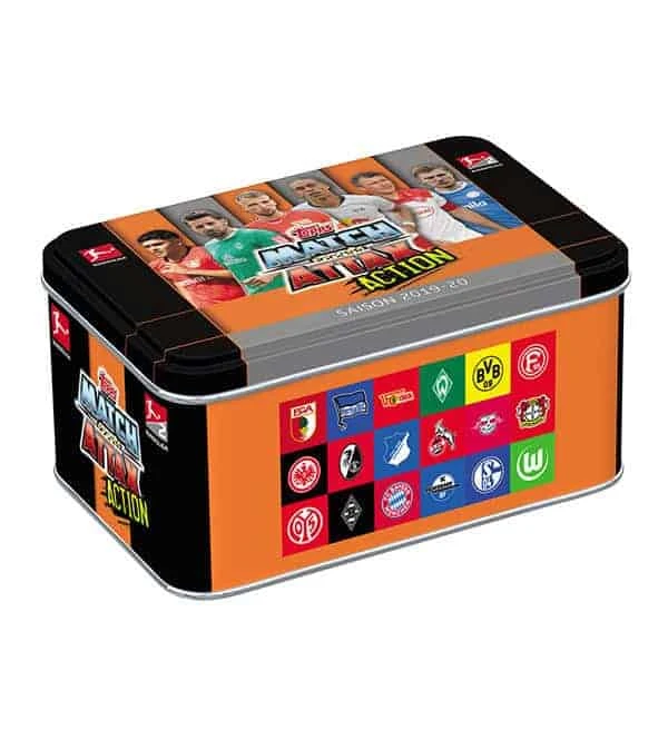 Mega-Tin aus der Topps Bundesliga Match Attax Action 2019/20 Trading Cards Kollektion mit 65 Karten: 30 Match Attax, 33 MA Action + 2 limitierten Karten: