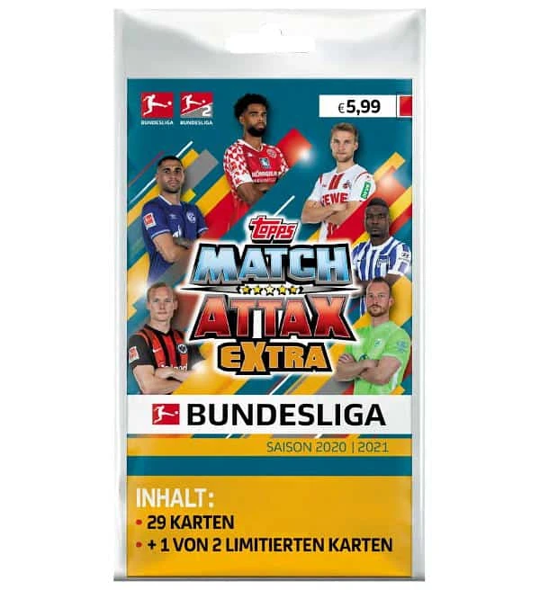 Blister der Kollektion “Topps Bundesliga Match Attax EXTRA 2020/21” mit 29 Karten + 1 Limited Edition Card.