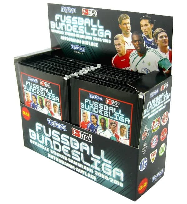 Display mit 100 Tüten der Topps Bundesliga 2009 / 2010 Sticker-Kollektion. Jede Tüte enthält 5 Sammelbilder, somit sind es 500 Sticker pro Box.