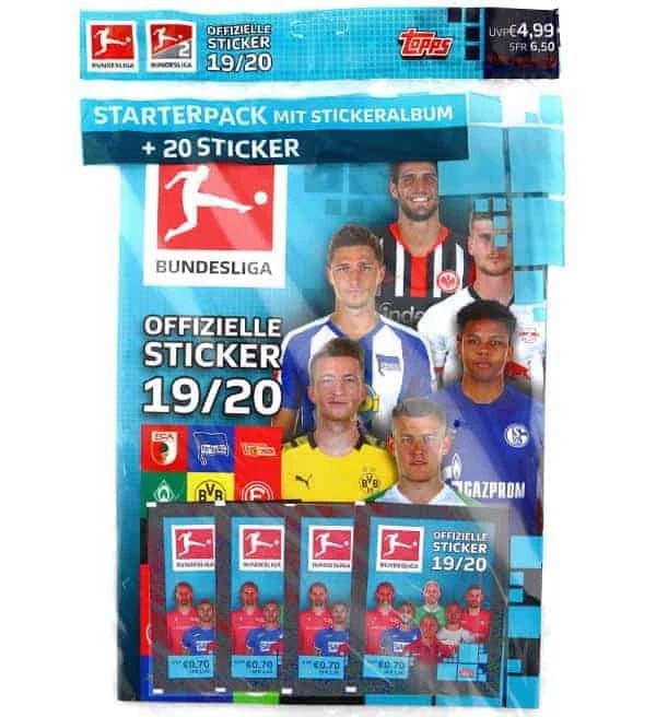 Starterpack mit Album + 4 Tüten der Topps Bundesliga 2019/2020 Sticker-Kollektion. Das Sammelalbum hat 48 Seiten und Platz für insgesamt 295 Sammelbilder.