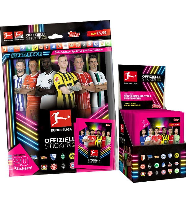 Starterpack (1 x Album + 20 Sticker) + Display mit 50 Tüten der Topps Bundesliga 2022/2023 Sticker-Kollektion. Jede Tüte enthält 7 Sammelbilder, somit sind es 350 Sticker pro Display.