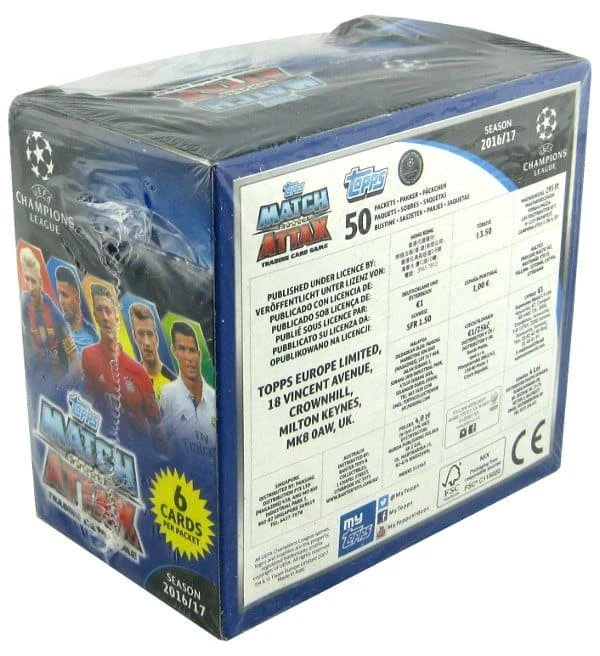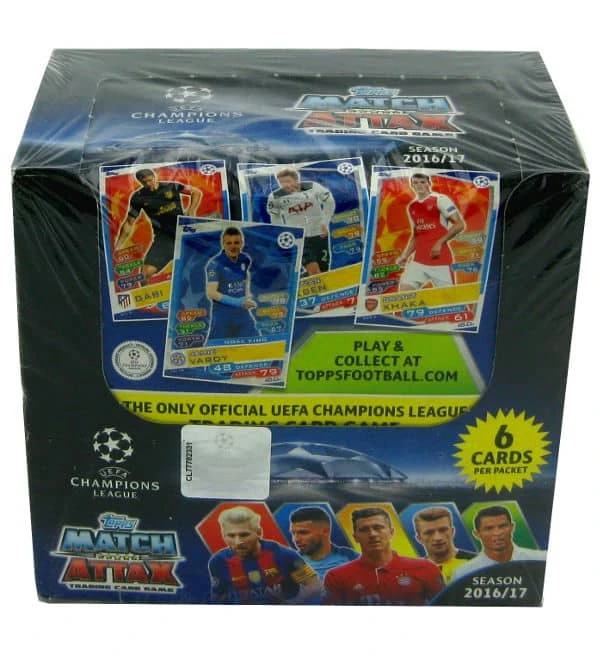 Display mit 50 Tüten der Topps Champions League Match Attax 2016 / 2017 Kollektion. Jede Tüte enthält 6 Karten, somit sind es 300 Cards pro Box.