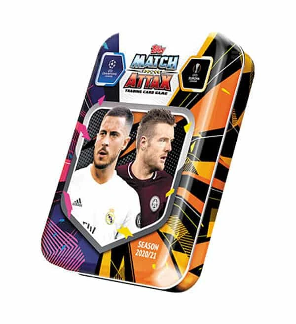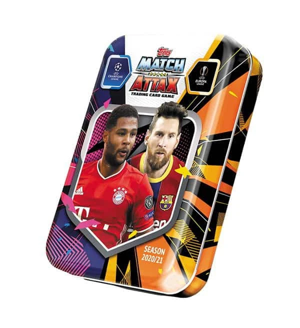 Mini-Tin der Topps Champions League Match Attax 2020/21 Trading Cards Serie mit 44 Karten + 1 Limited Edition Card (Lionel Messi – Gold, Silber oder Bronze).
