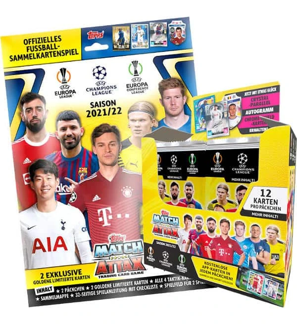 Starterpack + Display mit 24 Tüten zur Topps Champions League 2021/22 Match Attax Trading Card Serie mit folgendem Inhalt: