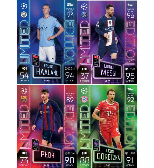 Booster Tin Set mit 4 Mini Tins der Topps Champions League Match Attax 2022/23 Trading Cards Serie. Jede Mini Tin enthält 36 Karten + 1 Limited Edition Gold Karte + 1 NEON BOOSTER Limited Edition Karte. Diese 4 Motive sind enthalten: