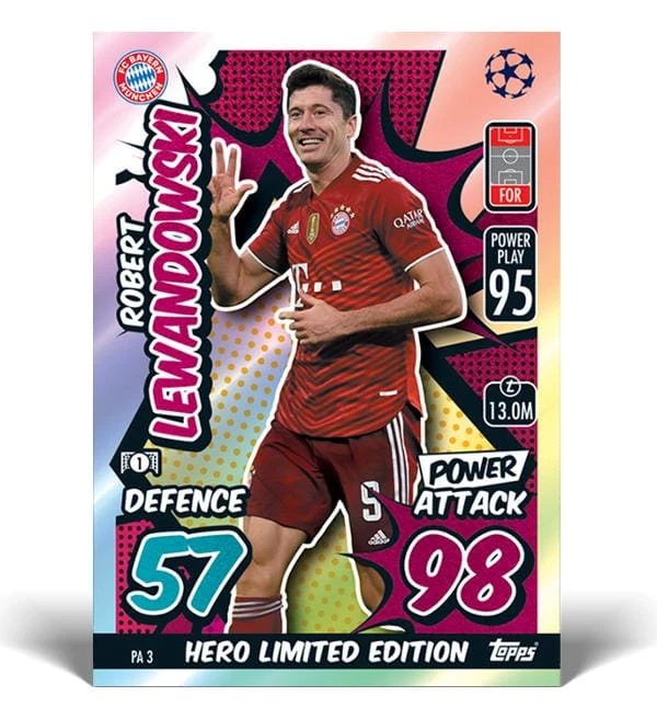 Mega Tin “Power Attack” der Topps Champions League Match Attax EXTRA 2021/22 Trading Cards Serie. Jede Mega Tin enthält 66 Karten + 3 Exclusive Power Cards + 1 exklusive Power Hero Squad Limited Edition Card.