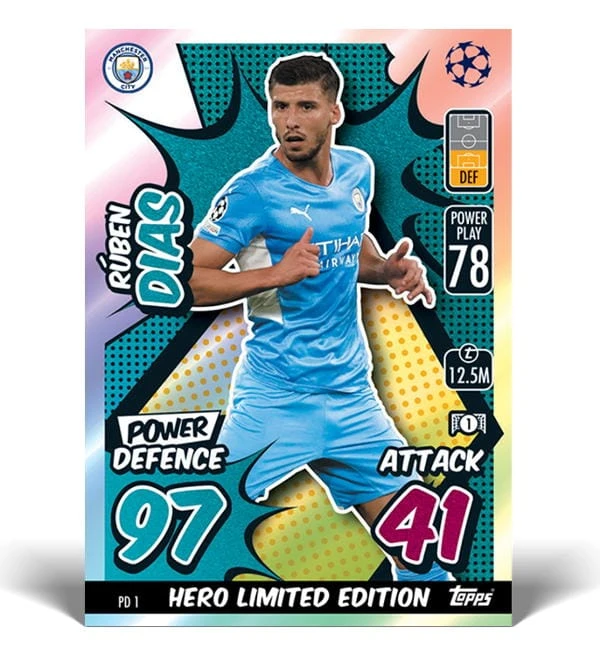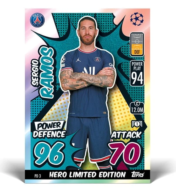 Mega Tin “Power Defence” der Topps Champions League Match Attax EXTRA 2021/22 Trading Cards Serie. Jede Mega Tin enthält 66 Karten + 3 Exclusive Power Cards + 1 exklusive Power Hero Squad Limited Edition Card.