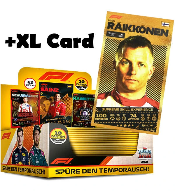 Display mit 24 Tüten + XL Card “Kimi Räikkönen – OC5” zur Topps Formula 1 Turbo Attax 2021 Trading Card Serie. Jede Tüte enthält 10 Karten.